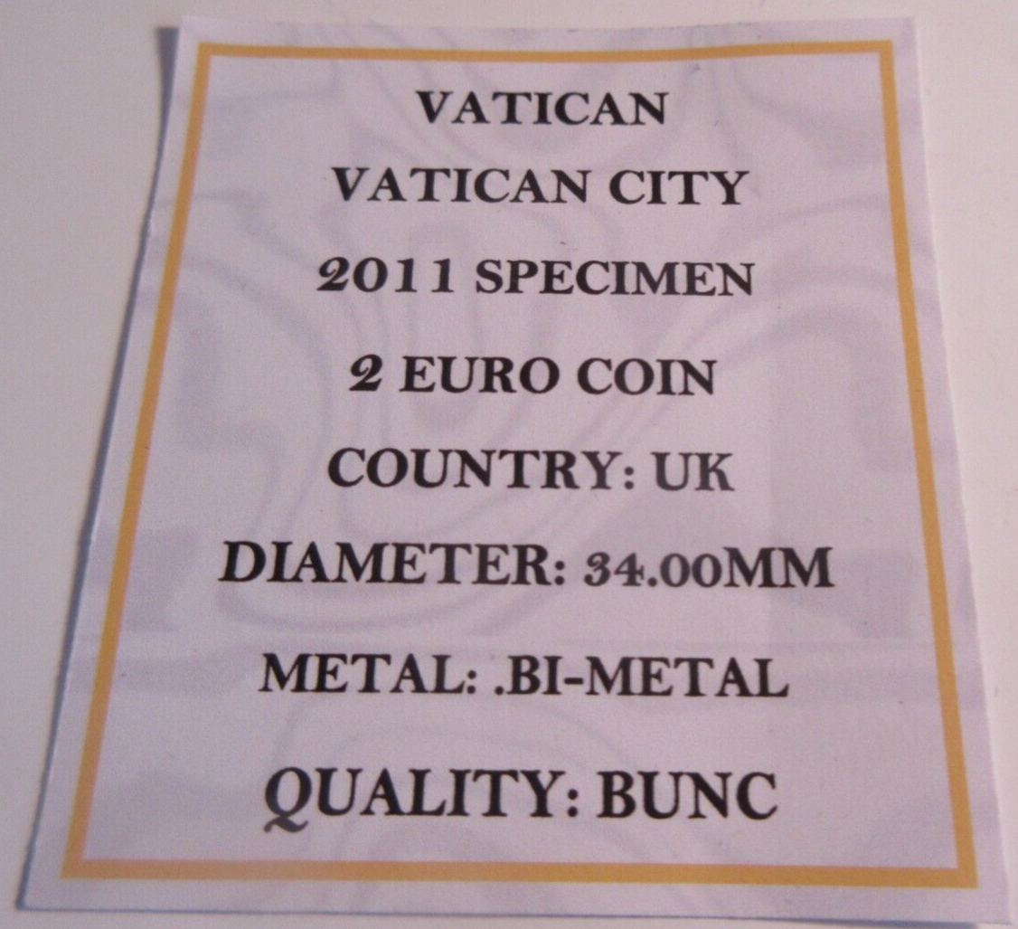 VATICAN VATICAN CITY 2011 SPECIMEN BUNC 2 EURO COIN BOX & COA